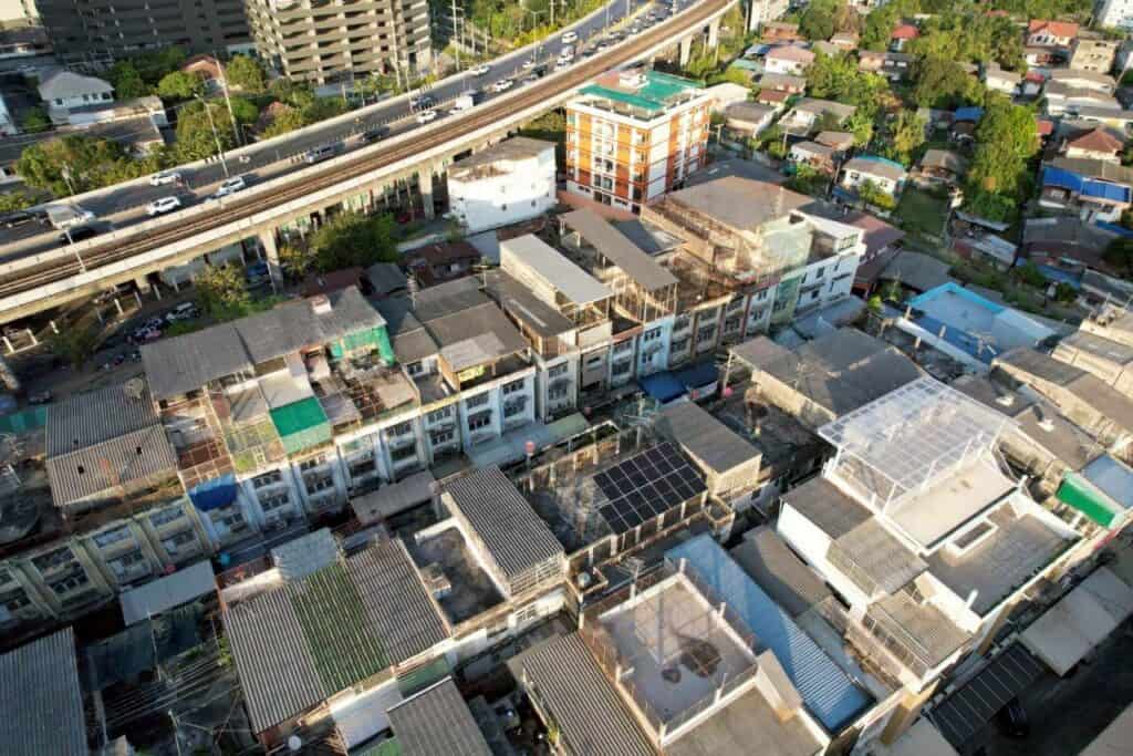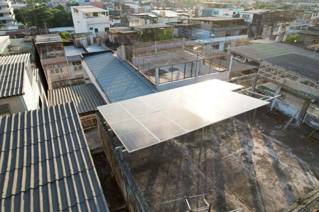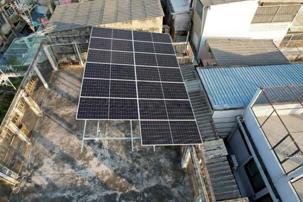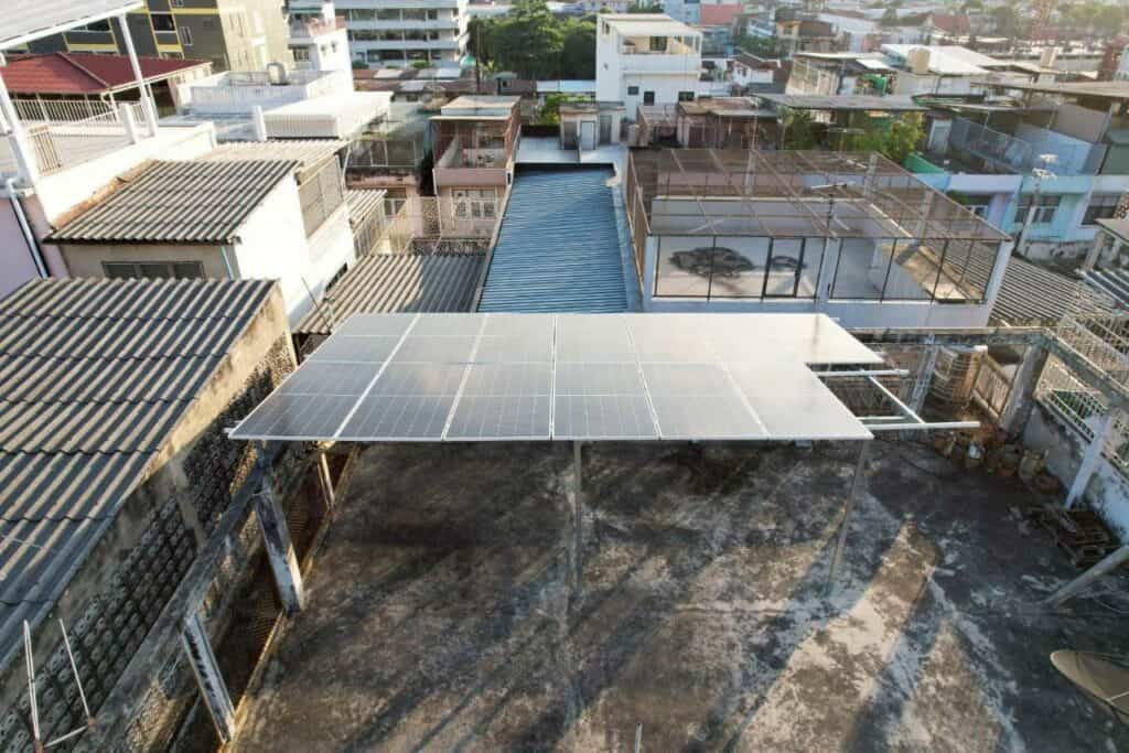 งานนี้ติดตั้งแผงโซล่าเซลล์บนดาดฟ้า จัดวางทิศทางรับแสงให้เหมาะสม พร้อมเดินระบบไฟและอุปกรณ์ป้องกันครบถ้วน ได้มาตรฐานความปลอดภัย และผ่านการตรวจเช็กระบบก่อนส่งมอบงานเรียบร้อย
